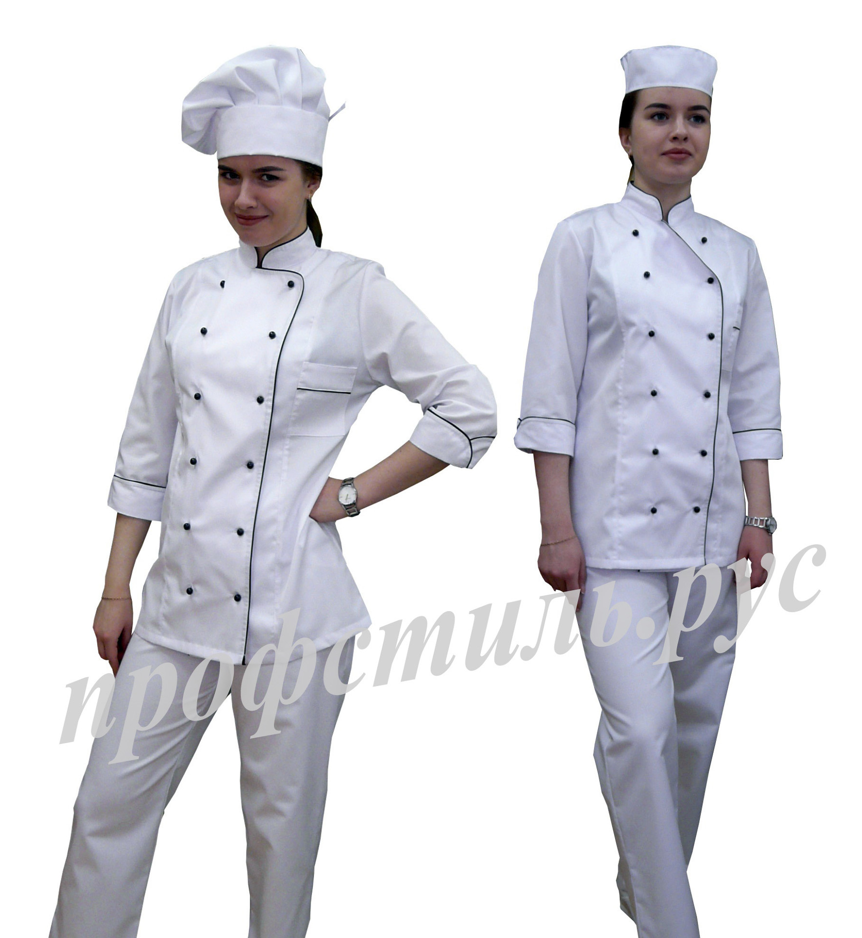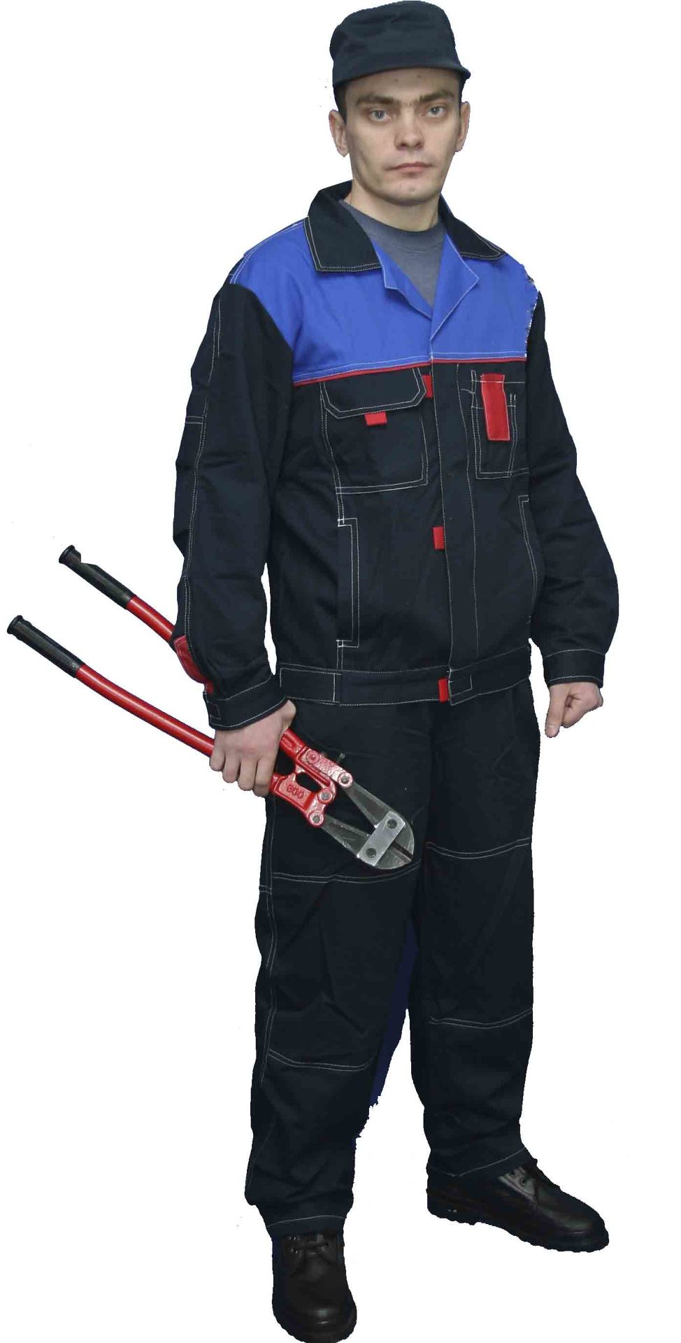 Костюм состоит из куртки и брюк. Брюки без застежки, с притачным поясом с эластичной тесьмой. Куртка с двубортной застежкой на петли и пукли. Рукава длиной ¾ с притачными отложными манжетами. Полочка и спинка с рельефами. Воротник – стойка. На левой полочке в верхней части может быть расположен как накладной, так и прорезной карман. Кант по воротнику, манжетам и борту выполнен из отделочной ткани. Размер 40-62