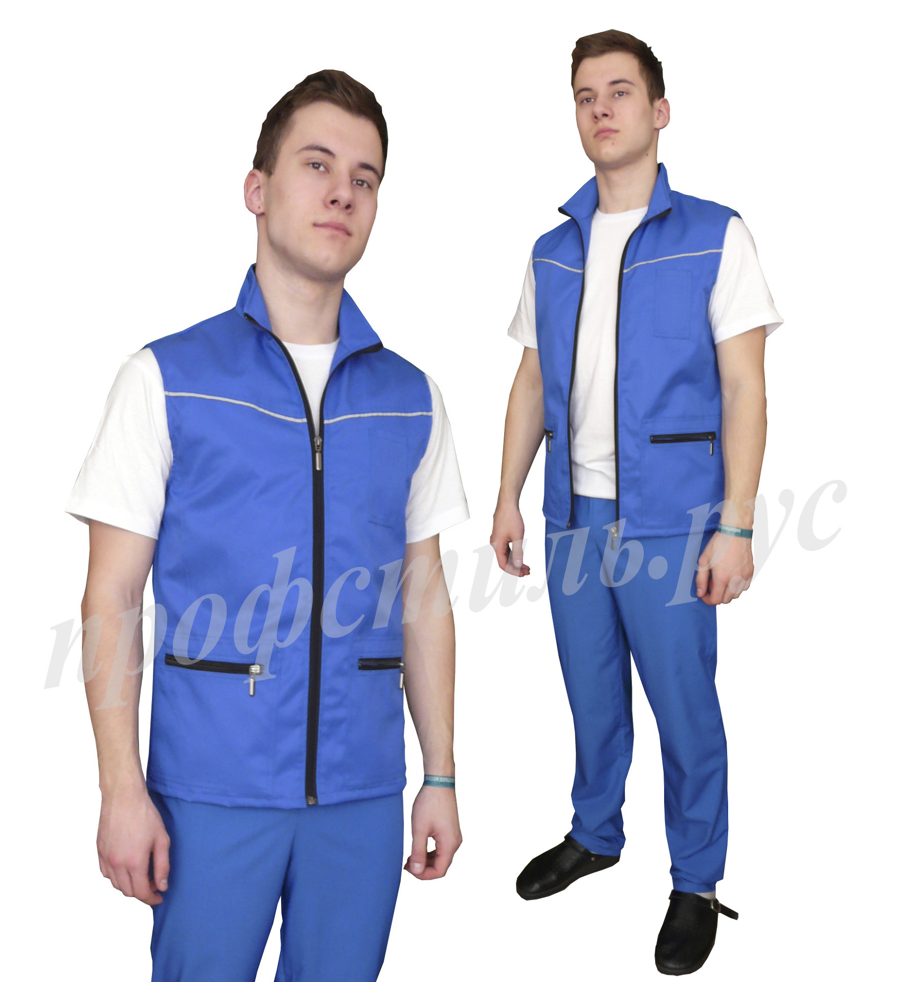 Жилет с застежкой на тесьму «молнию». Воротник стойка. Изделие с тремя накладными карманами: левым верхним и нижними с тесьмой «молнией». Полочки и спинка с кокетками и рельефами. Жилет может быть выполнен со светоотражающей полосой по спинке и кантами по полочкам. Изделие на подкладке. Размер 44-58